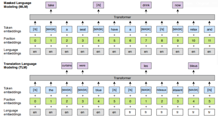 - 영어 문장에서 마스킹된 단어를 예측하기 위해 모델은 주변 영어 단어 또는 프랑스어 번역에 따라 모델이 영어와 프랑스어 표현을 맞추도록 장려