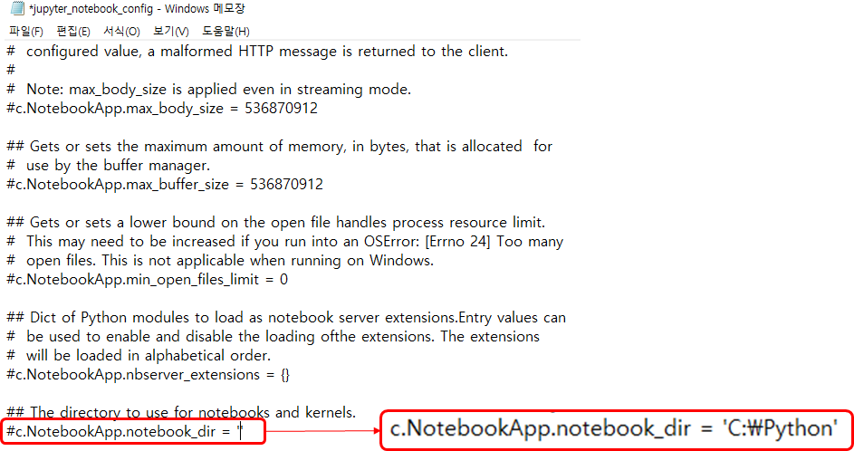 4. 아래 그림과 같이 #c.NotebookApp.notebook_dir='' 라는 문구를 찾아서 '' 사이에 원하는 주피터 노트북의 시작 폴더 위치 경로를 넣은 후 맨 앞의 #을 지워주고 저장합니다.