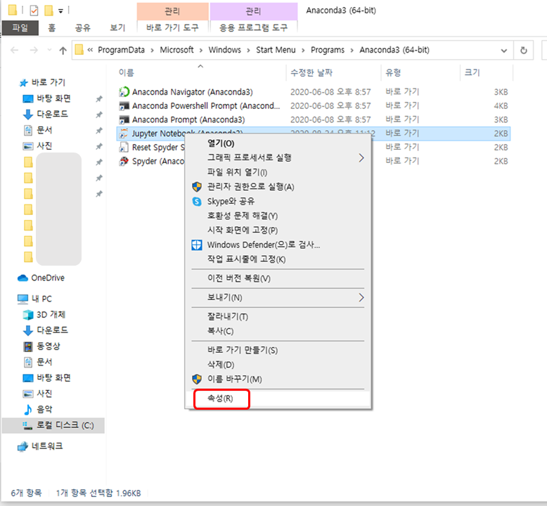 7. 폴더 내의 주피터 노트북 우클릭 → 속성