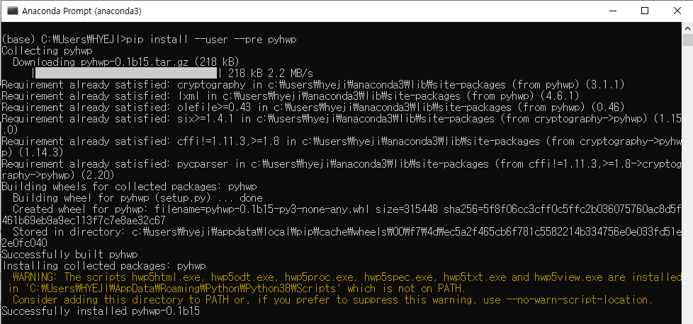 cmd 혹은 anaconda prompt에서 pyhwp를 설치해줍니다.