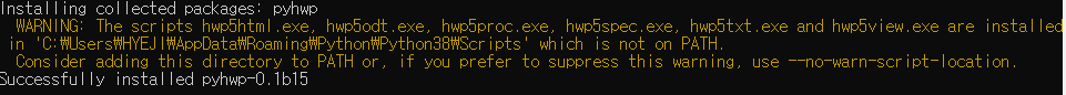 사실 답은 warning에 나와있었습니다. 처음 pyhwp를 설치할 때 warning을 잘 살펴보면 hyp5txt.exe, ... 등은 다른 폴더에 생성이 되어있다고 뜨죠?